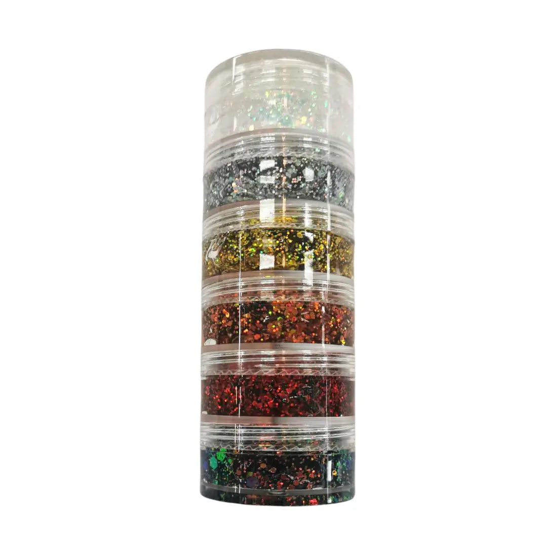 This glitter stack has holographic white, holographic silver, holographic gold, holographic orange, ruby red, and rainbow.