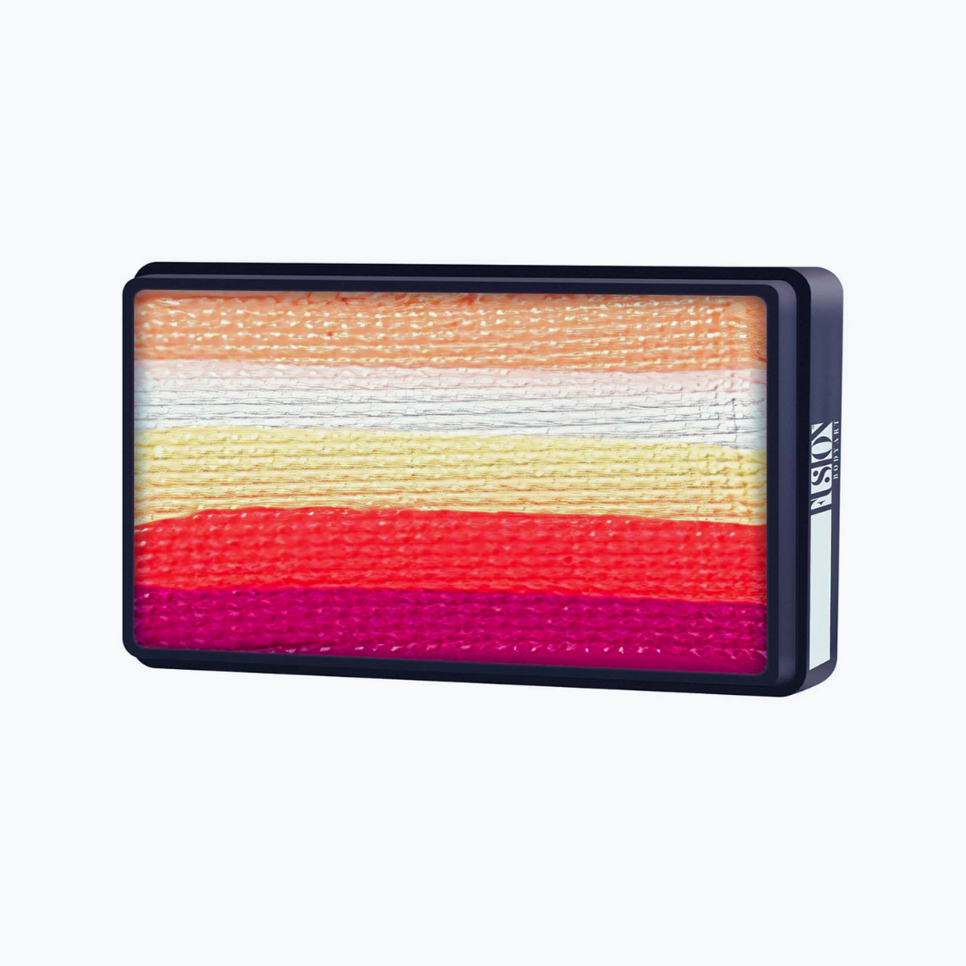 Fusion Split cakes have hit the market and are incredibly popular. Each split cake comes in a 30g container allowing for multiple applications to keep the kids smiling. Simply wet you 1 inch or 3/4 inch brush, load the paint onto the brush and then let your imagination and creativity take control. Fusion split cakes make face painting fun and very easy, as such are sort after by both professional and casual painters alike.