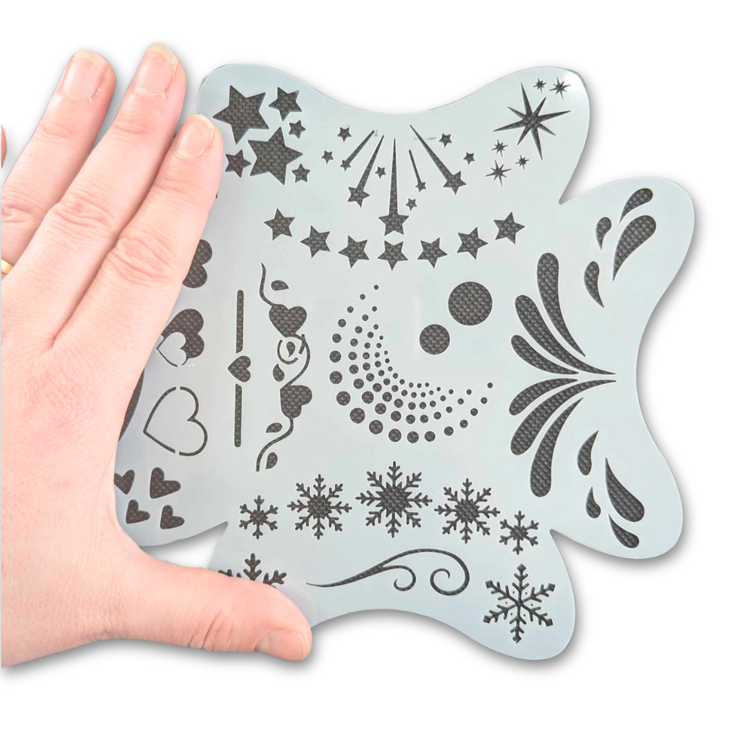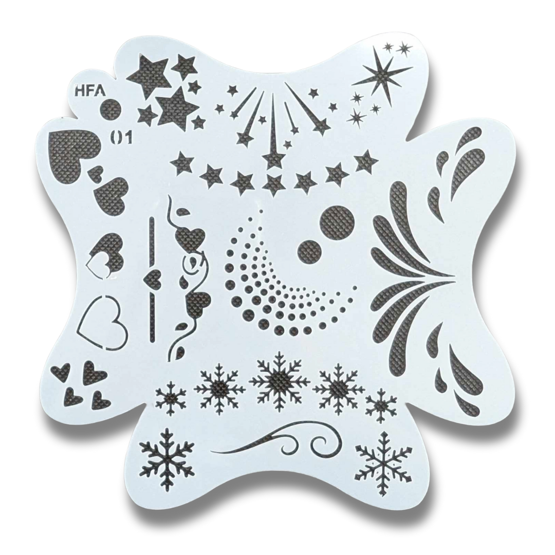 The new Master Stencil is a combined 4 in 1 stencil that gives you hundreds of designs on one stencil. Designed around a childs face contours, the Master Stencil is a brilliant new invention from Heart Face Art
